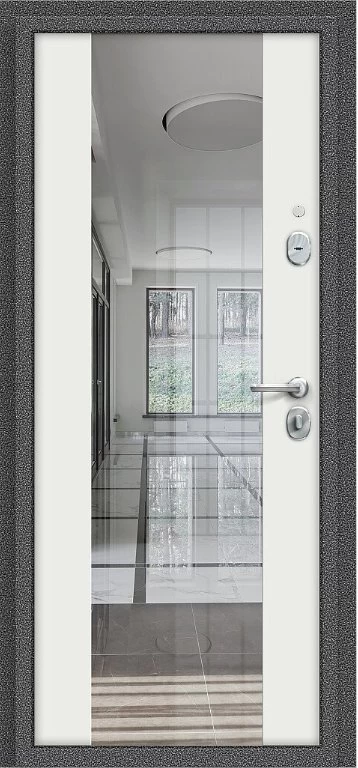 Надежная входная Дверь Браво Север-7 Антик Серебряный/Белый Зеркало премиум класса по цене 31 307 руб. Большая толщина стали защитит от проникновения в ваш дом, квартиру или коттедж. Используется очень качественная фурнитура: замки, цилиндры, ручки, защелки. Покрытие и отделка двери изготовлено под внимательным контролем производителя. Дверь имеет долгий срок службы и гарантию.